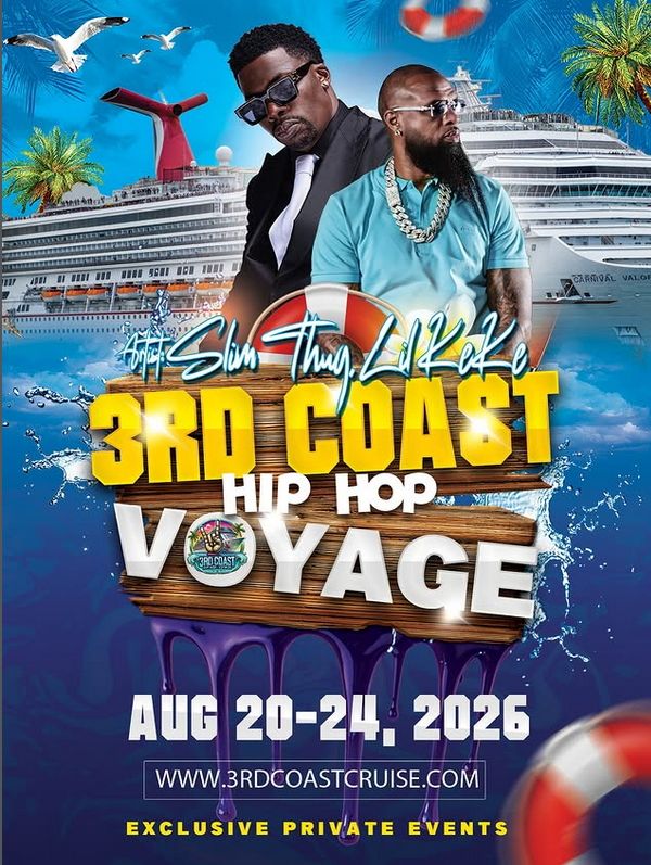 The annual 3rd Coast Hip-Hop Voyage is hittin’ the seas August 20–24, 2026, sailing out of Galveston, Texas and cruising to Cozumel, Mexico. For 4 unforgettable nights, we’re bringing the H-Town energy and Third Coast culture to the water.